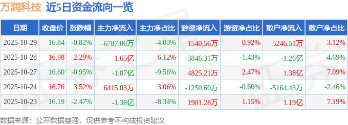 证券之星消息,截至2025年10月29日收盘,万润科技(002654)报收于16.84元,下跌0.82%,换手率11.82%,成交量99.87万手,成交额16.84亿元。