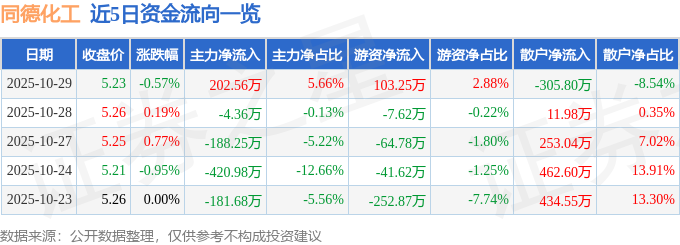 证券之星消息,截至2025年10月29日收盘,同德化工(002360)报收于5.23元,下跌0.57%,换手率2.09%,成交量6.84万手,成交额3579.54万元。