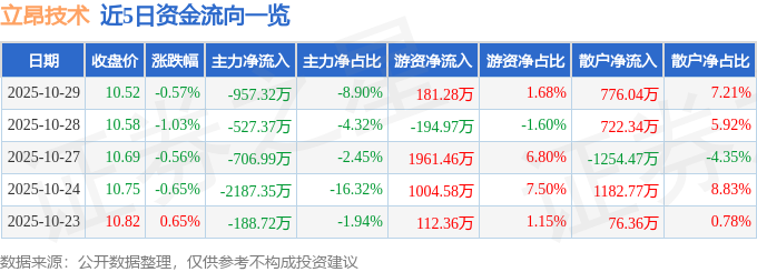 证券之星消息,截至2025年10月29日收盘,立昂技术(300603)报收于10.52元,下跌0.57%,换手率2.77%,成交量10.23万手,成交额1.08亿元。