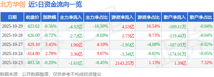 证券之星消息,截至2025年10月29日收盘,北方华创(002371)报收于423.62元,下跌0.56%,换手率0.9%,成交量6.5万手,成交额27.41亿元。