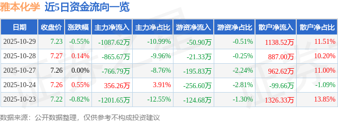 证券之星消息,截至2025年10月29日收盘,雅本化学(300261)报收于7.23元,下跌0.55%,换手率1.47%,成交量13.74万手,成交额9894.99万元。