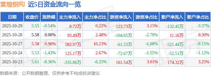 证券之星消息,截至2025年10月29日收盘,富煌钢构(002743)报收于5.55元,下跌0.54%,换手率1.63%,成交量7.1万手,成交额3927.86万元。