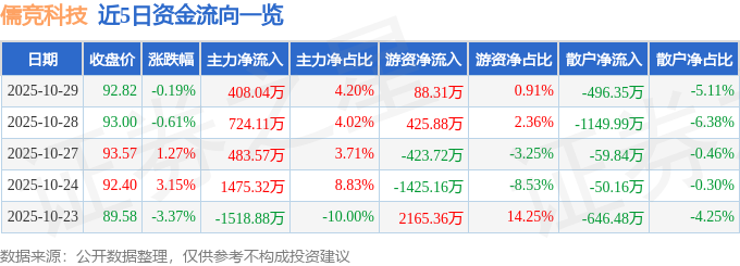 证券之星消息,截至2025年10月29日收盘,儒竞科技(301525)报收于92.82元,下跌0.19%,换手率2.12%,成交量1.05万手,成交额9713.34万元。