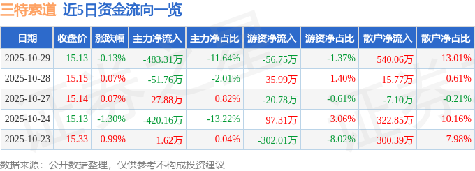 10月29日的资金流向数据方面,主力资金净流出483.31万元,占总成交额11.64%,游资资金净流出56.75万元,占总成交额1.37%,散户资金净流入540.06万元,占总成交额13.01%。