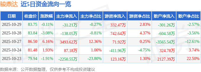 证券之星消息,截至2025年10月29日收盘,骏鼎达(301538)报收于83.75元,下跌0.11%,换手率4.52%,成交量1.41万手,成交额1.17亿元。