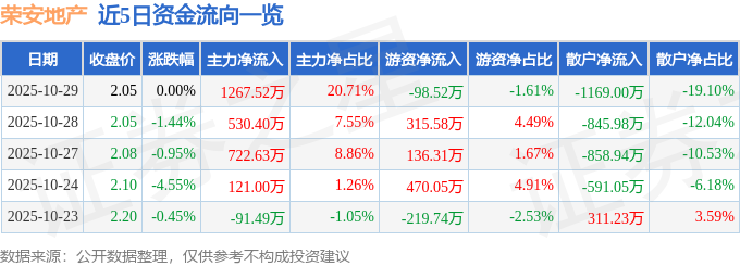 证券之星消息,截至2025年10月29日收盘,荣安地产(000517)报收于2.05元,上涨0.0%,换手率1.2%,成交量29.98万手,成交额6121.78万元。