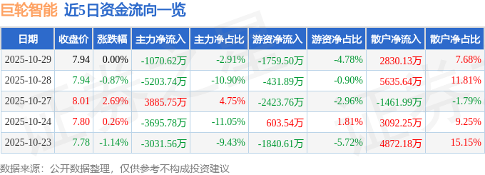 证券之星消息,截至2025年10月29日收盘,巨轮智能(002031)报收于7.94元,上涨0.0%,换手率2.4%,成交量46.59万手,成交额3.68亿元。