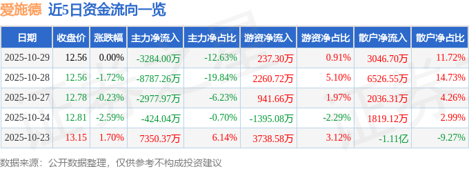 10月29日的资金流向数据方面,主力资金净流出3284.0万元,占总成交额12.63%,游资资金净流入237.3万元,占总成交额0.91%,散户资金净流入3046.7万元,占总成交额11.72%。