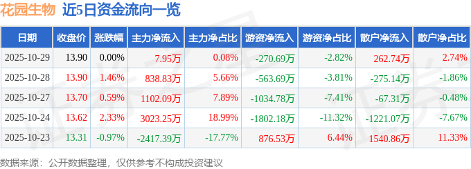 证券之星消息,截至2025年10月29日收盘,花园生物(300401)报收于13.9元,上涨0.0%,换手率1.29%,成交量6.92万手,成交额9604.94万元。