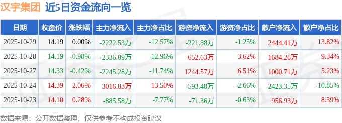 10月29日的资金流向数据方面,主力资金净流出2222.53万元,占总成交额12.57%,游资资金净流出221.88万元,占总成交额1.25%,散户资金净流入2444.41万元,占总成交额13.82%。