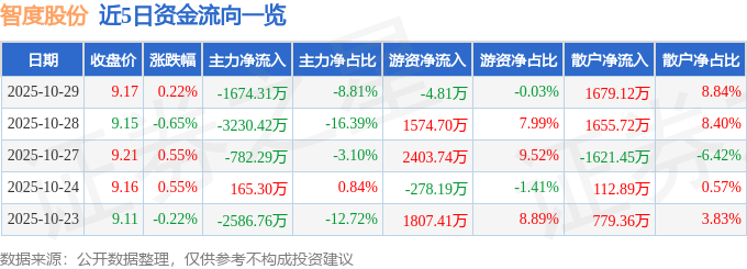 证券之星消息,截至2025年10月29日收盘,智度股份(000676)报收于9.17元,上涨0.22%,换手率1.65%,成交量20.83万手,成交额1.9亿元。