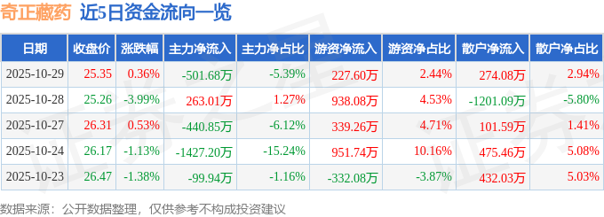 证券之星消息,截至2025年10月29日收盘,奇正藏药(002287)报收于25.35元,上涨0.36%,换手率0.65%,成交量3.7万手,成交额9311.17万元。