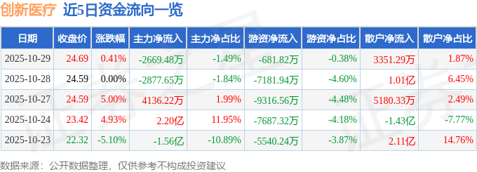 证券之星消息,截至2025年10月29日收盘,创新医疗(002173)报收于24.69元,上涨0.41%,换手率17.5%,成交量72.87万手,成交额17.94亿元。