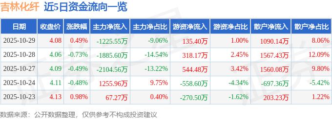 证券之星消息,截至2025年10月29日收盘,吉林化纤(000420)报收于4.08元,上涨0.49%,换手率1.35%,成交量33.28万手,成交额1.35亿元。
