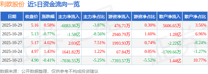 10月29日的资金流向数据方面,主力资金净流出6083.36万元,占总成交额3.87%,游资资金净流入476.71万元,占总成交额0.3%,散户资金净流入5606.65万元,占总成交额3.56%。
