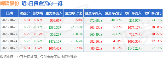 证券之星消息,截至2025年10月29日收盘,辉隆股份(002556)报收于5.81元,上涨0.69%,换手率1.23%,成交量11.62万手,成交额6729.83万元。