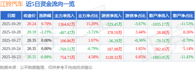 证券之星消息,截至2025年10月29日收盘,江铃汽车(000550)报收于20.24元,上涨0.7%,换手率0.86%,成交量4.48万手,成交额8975.28万元。