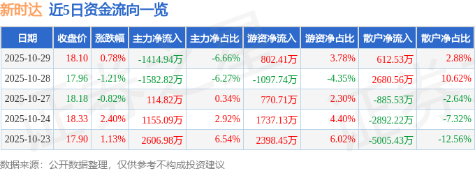 证券之星消息,截至2025年10月29日收盘,新时达(002527)报收于18.1元,上涨0.78%,换手率2.22%,成交量11.77万手,成交额2.12亿元。