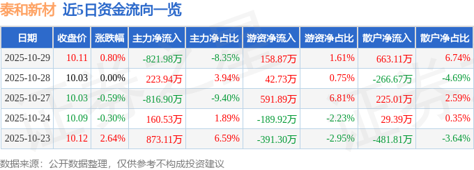 10月29日的资金流向数据方面,主力资金净流出821.98万元,占总成交额8.35%,游资资金净流入158.87万元,占总成交额1.61%,散户资金净流入663.11万元,占总成交额6.74%。