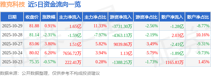 证券之星消息,截至2025年10月29日收盘,雅克科技(002409)报收于81.88元,上涨0.91%,换手率5.62%,成交量17.89万手,成交额14.59亿元。