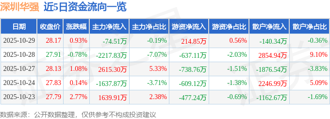 证券之星消息,截至2025年10月29日收盘,深圳华强(000062)报收于28.17元,上涨0.93%,换手率1.31%,成交量13.71万手,成交额3.85亿元。