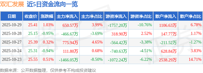 证券之星消息,截至2025年10月29日收盘,双汇发展(000895)报收于25.41元,上涨1.03%,换手率0.19%,成交量6.44万手,成交额1.63亿元。