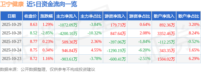 证券之星消息,截至2025年10月29日收盘,卫宁健康(300253)报收于8.63元,上涨1.29%,换手率1.7%,成交量32.53万手,成交额2.79亿元。