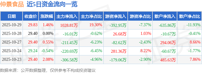 证券之星消息,截至2025年10月29日收盘,仲景食品(300908)报收于29.83元,上涨1.46%,换手率1.47%,成交量1.81万手,成交额5329.88万元。