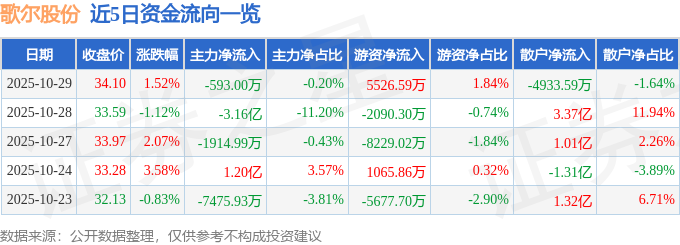 证券之星消息,截至2025年10月29日收盘,歌尔股份(002241)报收于34.1元,上涨1.52%,换手率2.83%,成交量88.72万手,成交额30.07亿元。