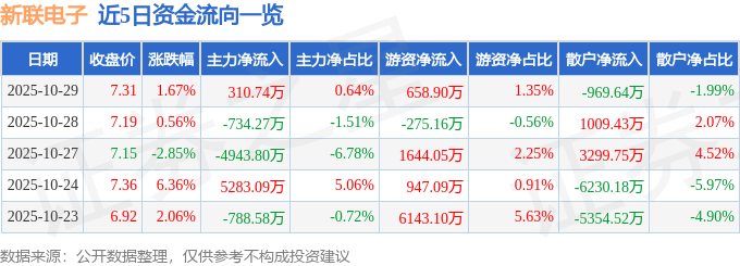 证券之星消息,截至2025年10月29日收盘,新联电子(002546)报收于7.31元,上涨1.67%,换手率8.35%,成交量66.94万手,成交额4.86亿元。