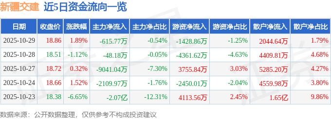 证券之星消息,截至2025年10月29日收盘,新疆交建(002941)报收于18.86元,上涨1.89%,换手率8.49%,成交量61.93万手,成交额11.44亿元。