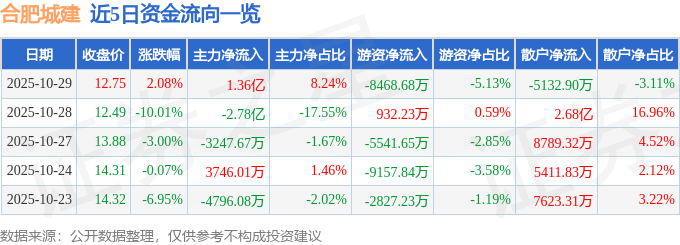 证券之星消息,截至2025年10月29日收盘,合肥城建(002208)报收于12.75元,上涨2.08%,换手率16.54%,成交量132.86万手,成交额16.52亿元。