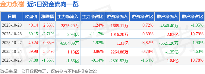 证券之星消息,截至2025年10月29日收盘,金力永磁(300748)报收于40.14元,上涨2.53%,换手率5.19%,成交量58.73万手,成交额23.26亿元。