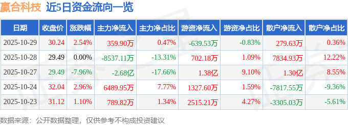 证券之星消息,截至2025年10月29日收盘,赢合科技(300457)报收于30.24元,上涨2.54%,换手率4.02%,成交量25.66万手,成交额7.69亿元。
