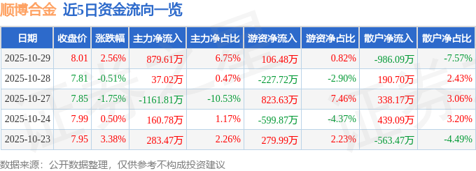 证券之星消息,截至2025年10月29日收盘,顺博合金(002996)报收于8.01元,上涨2.56%,换手率3.96%,成交量16.5万手,成交额1.3亿元。