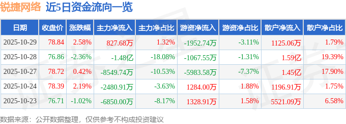 证券之星消息,截至2025年10月29日收盘,锐捷网络(301165)报收于78.84元,上涨2.58%,换手率8.51%,成交量8.13万手,成交额6.29亿元。