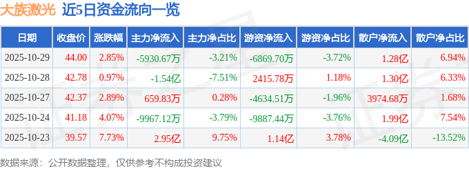 证券之星消息,截至2025年10月29日收盘,大族激光(002008)报收于44.0元,上涨2.85%,换手率4.44%,成交量42.44万手,成交额18.46亿元。