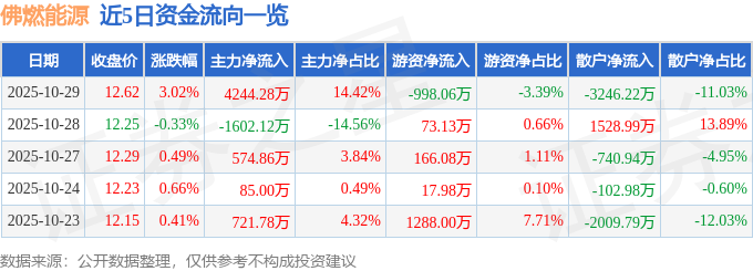 证券之星消息,截至2025年10月29日收盘,佛燃能源(002911)报收于12.62元,上涨3.02%,换手率1.84%,成交量23.4万手,成交额2.94亿元。