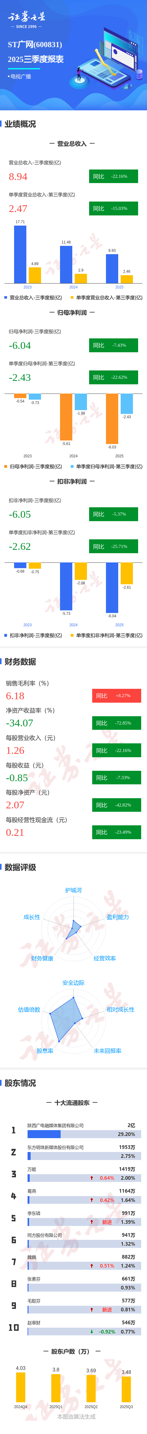 证券之星消息,ST广网2025年三季报显示,前三季度公司主营收入8.94亿元,同比下降22.16%;归母净利润-6.04亿元,同比下降7.44%;扣非净利润-6.05亿元,同比下降5.38%;其中2025年第三季度,公司单季度主营收入2.47亿元,同比下降15.03%;单季度归母净利润-2.43亿元,同比下降22.63%;单季度扣非净利润-2.62亿元,同比下降25.72%;负债率86.02%,投资收益319.99万元,财务费用1.7亿元,毛利率6.18%。