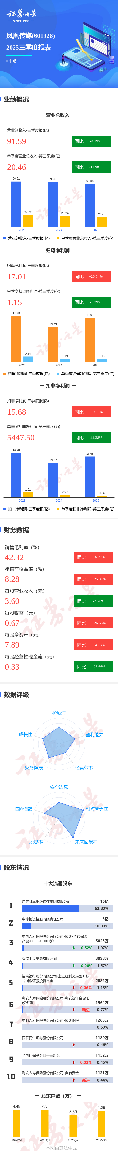证券之星消息,凤凰传媒2025年三季报显示,前三季度公司主营收入91.59亿元,同比下降4.2%;归母净利润17.01亿元,同比上升26.64%;扣非净利润15.68亿元,同比上升19.96%;其中2025年第三季度,公司单季度主营收入20.46亿元,同比下降11.98%;单季度归母净利润1.15亿元,同比下降3.3%;单季度扣非净利润5447.5万元,同比下降44.39%;负债率35.45%,投资收益1.23亿元,财务费用-2.52亿元,毛利率42.32%。