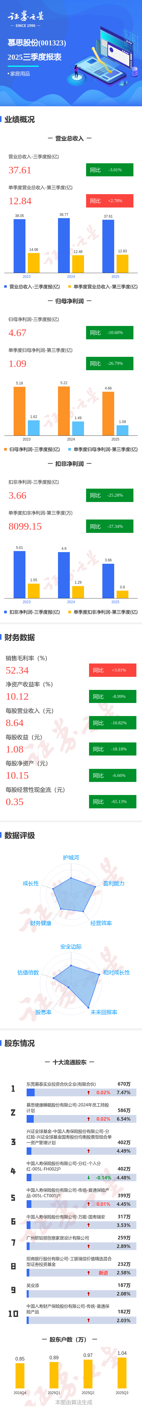 证券之星消息,慕思股份2025年三季报显示,前三季度公司主营收入37.61亿元,同比下降3.01%;归母净利润4.67亿元,同比下降10.61%;扣非净利润3.66亿元,同比下降25.29%;其中2025年第三季度,公司单季度主营收入12.84亿元,同比上升2.79%;单季度归母净利润1.09亿元,同比下降26.8%;单季度扣非净利润8099.15万元,同比下降37.35%;负债率42.62%,投资收益3282.2万元,财务费用1405.27万元,毛利率52.34%。