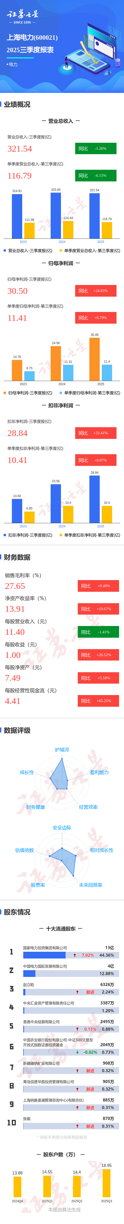 证券之星消息,上海电力2025年三季报显示,前三季度公司主营收入321.54亿元,同比下降1.26%;归母净利润30.5亿元,同比上升24.04%;扣非净利润28.84亿元,同比上升22.42%;其中2025年第三季度,公司单季度主营收入116.79亿元,同比下降6.15%;单季度归母净利润11.41亿元,同比上升0.8%;单季度扣非净利润10.41亿元,同比上升0.07%;负债率69.8%,投资收益11.61亿元,财务费用20.28亿元,毛利率27.65%。