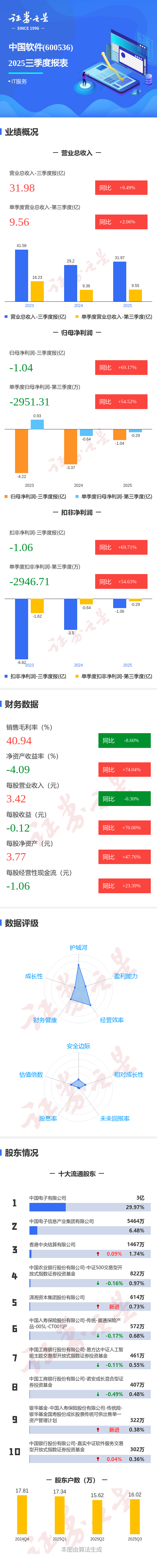 证券之星消息,中国软件2025年三季报显示,前三季度公司主营收入31.98亿元,同比上升9.5%;归母净利润-1.04亿元,同比上升69.18%;扣非净利润-1.06亿元,同比上升69.72%;其中2025年第三季度,公司单季度主营收入9.56亿元,同比上升2.06%;单季度归母净利润-2951.31万元,同比上升54.53%;单季度扣非净利润-2946.71万元,同比上升54.64%;负债率40.94%,投资收益3020.63万元,财务费用1755.96万元,毛利率40.94%。