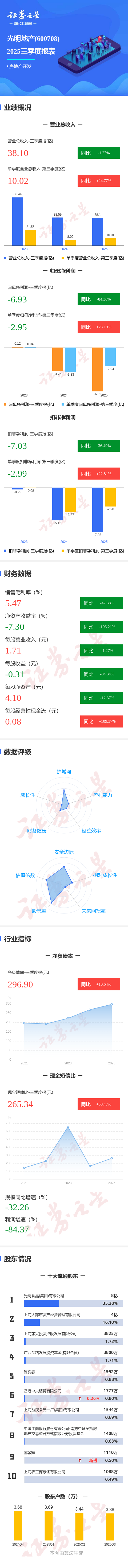 证券之星消息,光明地产2025年三季报显示,前三季度公司主营收入38.1亿元,同比下降1.28%;归母净利润-6.93亿元,同比下降84.37%;扣非净利润-7.03亿元,同比下降36.5%;其中2025年第三季度,公司单季度主营收入10.02亿元,同比上升24.77%;单季度归母净利润-2.95亿元,同比上升23.2%;单季度扣非净利润-2.99亿元,同比上升22.81%;负债率83.45%,投资收益-2315.52万元,财务费用4.97亿元,毛利率5.47%。