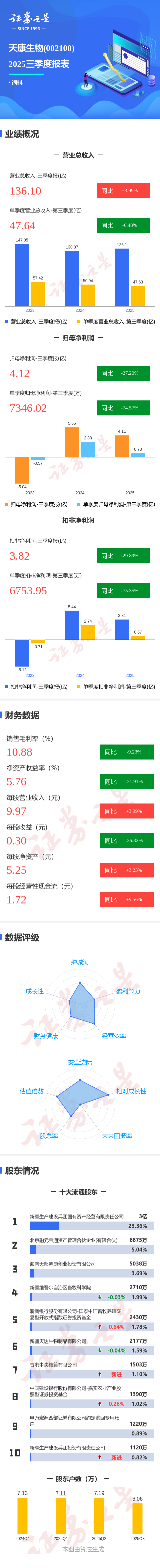 证券之星消息,天康生物2025年三季报显示,前三季度公司主营收入136.1亿元,同比上升4.0%;归母净利润4.12亿元,同比下降27.2%;扣非净利润3.82亿元,同比下降29.89%;其中2025年第三季度,公司单季度主营收入47.64亿元,同比下降6.49%;单季度归母净利润7346.02万元,同比下降74.58%;单季度扣非净利润6753.95万元,同比下降75.36%;负债率47.86%,投资收益-949.26万元,财务费用1.03亿元,毛利率10.88%。