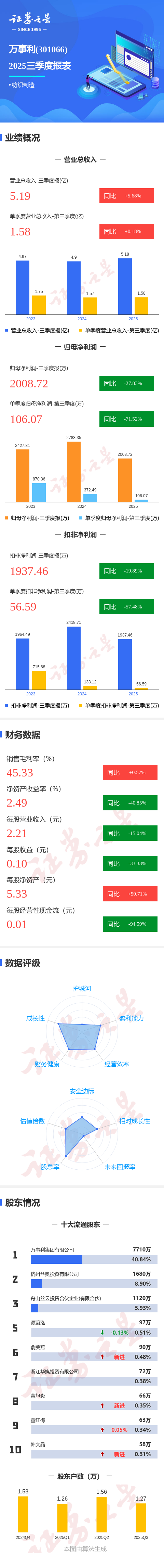 证券之星消息,万事利2025年三季报显示,前三季度公司主营收入5.19亿元,同比上升5.68%;归母净利润2008.72万元,同比下降27.83%;扣非净利润1937.46万元,同比下降19.9%;其中2025年第三季度,公司单季度主营收入1.58亿元,同比上升0.19%;单季度归母净利润106.07万元,同比下降71.52%;单季度扣非净利润56.59万元,同比下降57.49%;负债率24.44%,投资收益-1.58万元,财务费用-278.28万元,毛利率45.33%。