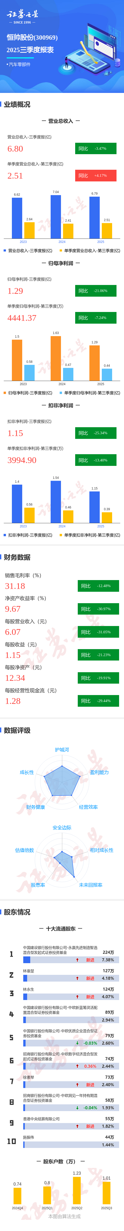 证券之星消息,恒帅股份2025年三季报显示,前三季度公司主营收入6.8亿元,同比下降3.47%;归母净利润1.29亿元,同比下降21.07%;扣非净利润1.15亿元,同比下降25.34%;其中2025年第三季度,公司单季度主营收入2.51亿元,同比上升4.18%;单季度归母净利润4441.37万元,同比下降7.25%;单季度扣非净利润3994.9万元,同比下降13.41%;负债率30.12%,投资收益681.52万元,财务费用-342.33万元,毛利率31.18%。