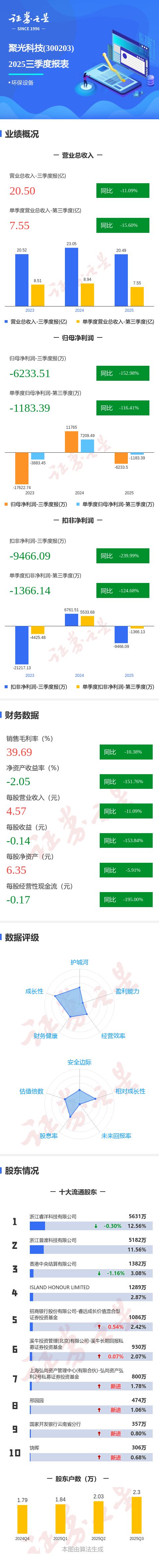 证券之星消息,聚光科技2025年三季报显示,前三季度公司主营收入20.5亿元,同比下降11.1%;归母净利润-6233.51万元,同比下降152.98%;扣非净利润-9466.09万元,同比下降240.0%;其中2025年第三季度,公司单季度主营收入7.55亿元,同比下降15.61%;单季度归母净利润-1183.39万元,同比下降116.41%;单季度扣非净利润-1366.14万元,同比下降124.69%;负债率64.89%,投资收益2737.9万元,财务费用9253.23万元,毛利率39.69%。