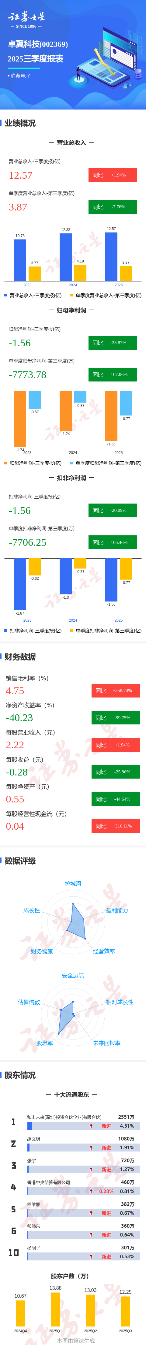 证券之星消息,卓翼科技2025年三季报显示,前三季度公司主营收入12.57亿元,同比上升1.95%;归母净利润-1.56亿元,同比下降25.88%;扣非净利润-1.56亿元,同比下降20.1%;其中2025年第三季度,公司单季度主营收入3.87亿元,同比下降7.77%;单季度归母净利润-7773.78万元,同比下降107.06%;单季度扣非净利润-7706.25万元,同比下降106.46%;负债率87.38%,投资收益0.0万元,财务费用3092.7万元,毛利率4.75%。