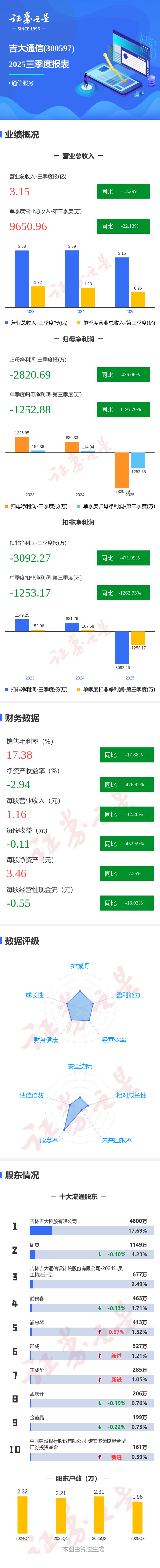 证券之星消息,吉大通信2025年三季报显示,前三季度公司主营收入3.15亿元,同比下降12.29%;归母净利润-2820.69万元,同比下降436.06%;扣非净利润-3092.27万元,同比下降472.0%;其中2025年第三季度,公司单季度主营收入9650.96万元,同比下降22.14%;单季度归母净利润-1252.88万元,同比下降1195.7%;单季度扣非净利润-1253.17万元,同比下降1263.73%;负债率38.35%,投资收益3.0万元,财务费用830.38万元,毛利率17.38%。